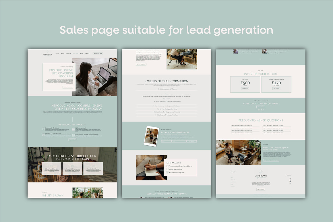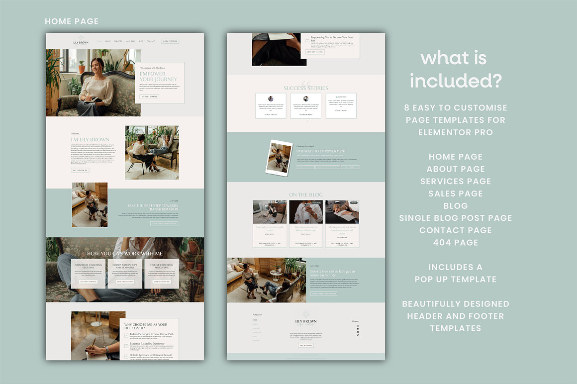 The Lily Brown Elementor Template Kit includes pre-designed pages for all the essentials, including: